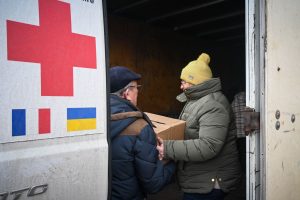 Le lendemain, nous visitons un dispensaire : les gens font la queue dehors, exposés au froid avant d’entrer. Ils viennent chercher du réconfort, des vêtements, de la nourriture, des livres. La directrice nous fait entrer dans son bureau, elle nous explique le fonctionnement de son établissement. Une carte de l’Ukraine est dépliée au mur pour indiquer les villages d’origine des nécessiteux : tous étaient installés près de la ligne de front à quelques kilomètres de là ; ils ont dû fuir.